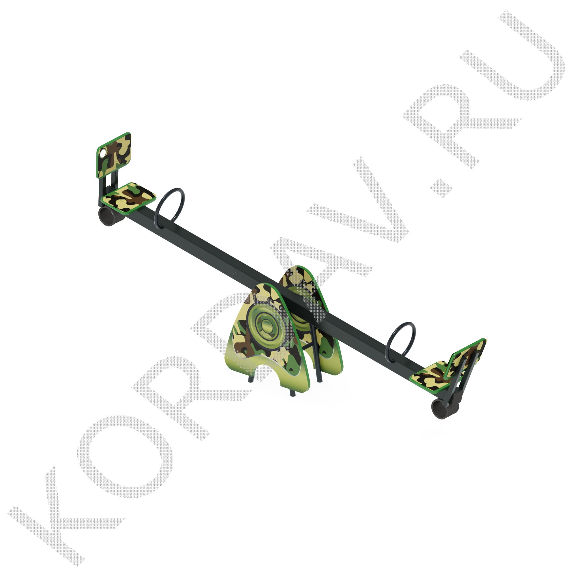 Балансир: Состоит из квадратной профильной трубы сечения 80х80 мм с толщиной стенки 3 мм. К основе балансира приварены квадратный стальной фланец размером 150х150х4 мм; два крепления спинки, сделанные из квадратной профильной трубы сечения 30х30 мм с толщиной стенки 2 мм; две круглые ручки, сделанные из круглой трубы наружным диаметром 21 мм и две стальные пластины для крепления амортизатора. Размер балансира: 3020х320х360 мм. 1 шт
